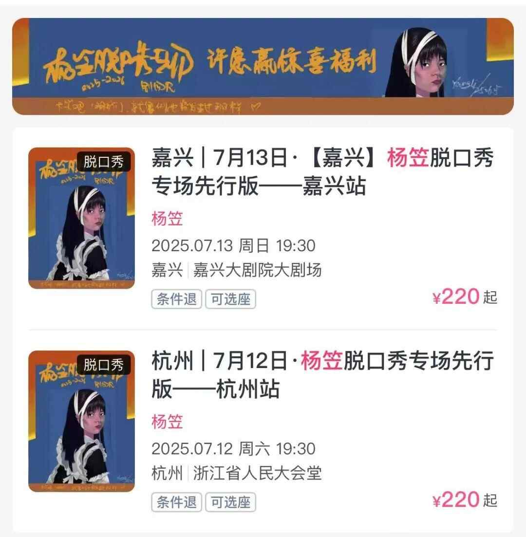 7月9日,杨笠官宣杭州站,并发布明确票务须知抵制黄牛行为。此前杨笠上海脱口秀专场就因坚决抵制黄牛票的举措引发广泛关注。杨笠杭州站将于7月10日10:58开票。其脱口秀专场票价最低220元,最高580元。