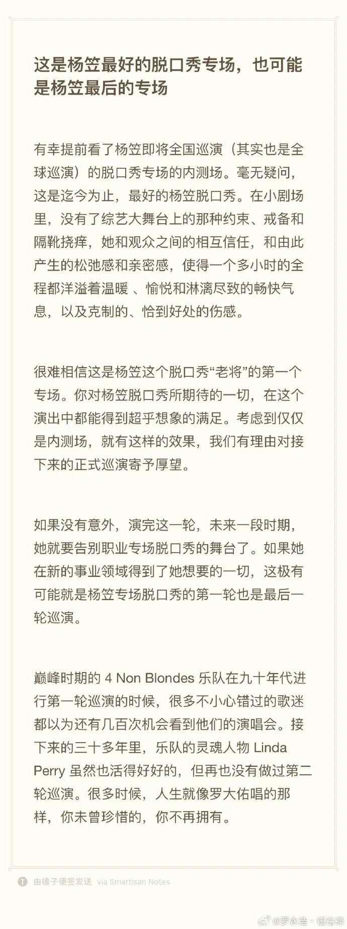 7月11日,罗永浩发长文点评杨笠的脱口秀专场,透露对方可能将告别脱口秀。“这是杨笠最好的脱口秀专场,也可能是杨笠最后的专场……你未曾珍惜的,你不再拥有。”