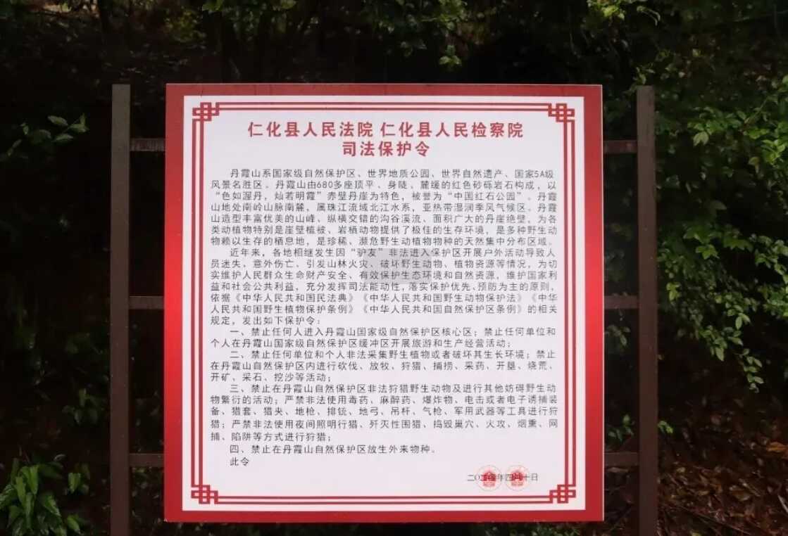 2024年4月,仁化县人民法院、仁化县人民检察院在丹霞山国家级自然保护区内联合发布环境司法保护令并竖牌公告,围绕保护野生动植物、规范人类活动等方面依法提出“八个禁止”,这也是当地首份环境司法保护令。