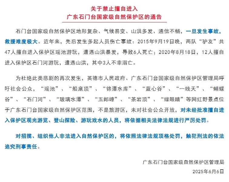 今年6月6日,广东石门台国家级自然保护区管理局发布《关于禁止擅自进入广东石门台国家级自然保护区的通告》。通报称,石门台国家级自然保护区地形复杂、气候易变、山洪多发、通信不畅,一旦发生事故,救援难度极大。