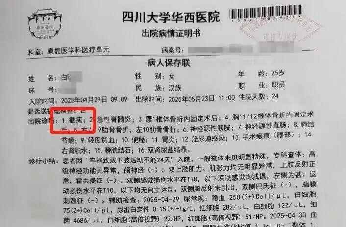 4月29日,白女士在四川大学华西医院康复医学科办理入院并继续接受治疗,一个月后又转入成都某康复医院综合康复科。四川大学华西医院出具的出院病情证明书显示,白女士因“车祸致双下肢活动不能24天”入院,被诊断有截瘫、急性脊髓炎等问题。