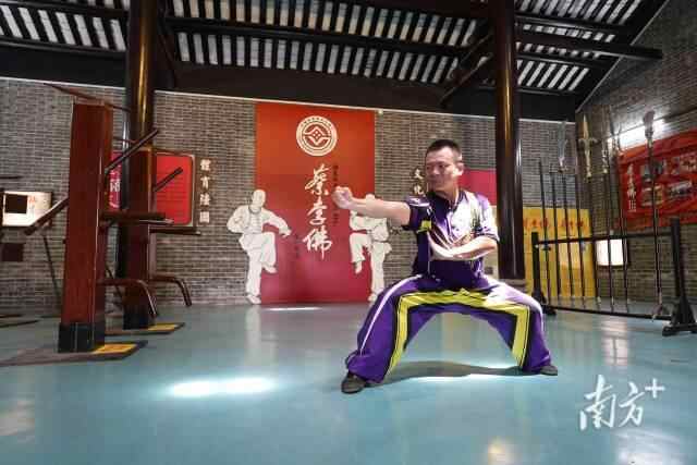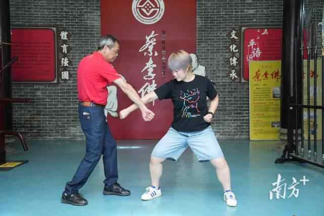 蔡李佛拳国家级非遗传承人陈忠杰(左)在指导记者。