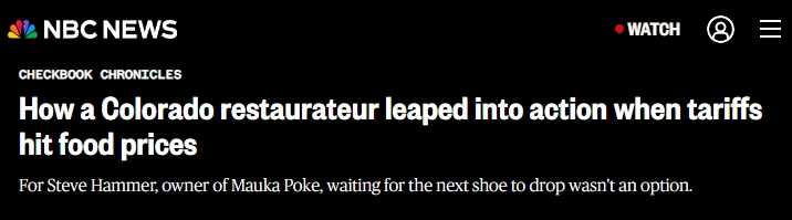 据美国全国广播公司新闻(NBC News)报道,美国政府宣布所谓“对等关税”当天,科罗拉多州鹰镇餐厅老板史蒂夫·哈默紧急采购了7箱共200磅的金枪鱼。“那天我可能多了一万根白发,完全慌了神。”他回忆说。厨房经理虽对其塞满冰箱的行为颇有微词,但哈默解释此举是为规避关税生效后的涨价风险。