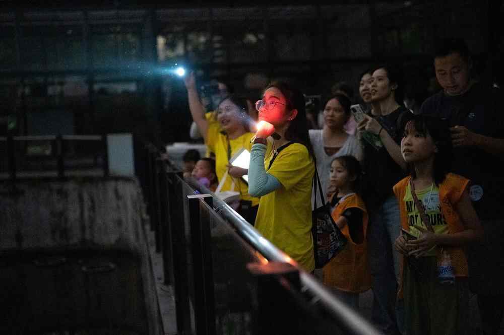 “大家发现‘爬行界大熊猫’瑶山鳄蜥了吗?”在科普导师压低的声音引导下,亲子家庭们屏息凝神,凭借手电筒的微光,在展缸的溪流岩石中仔细搜寻。“这份静谧,是白日游园无法触及的神秘!”一位成员悄声道。