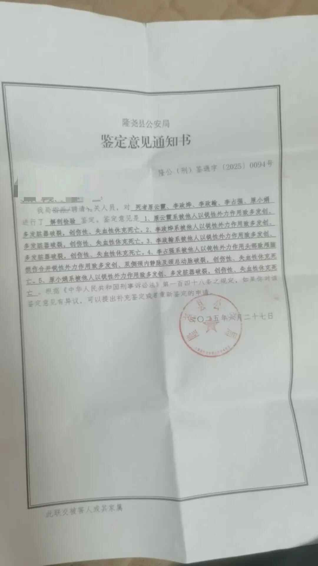 据李先生向记者出具的警方鉴定意见通知书显示,被害人原某霞、李某烨、李某翰、李某强、原某娟几乎都是被他人以锐性外力致多发创、多发脏器破裂,创伤性、失血性休克死亡。