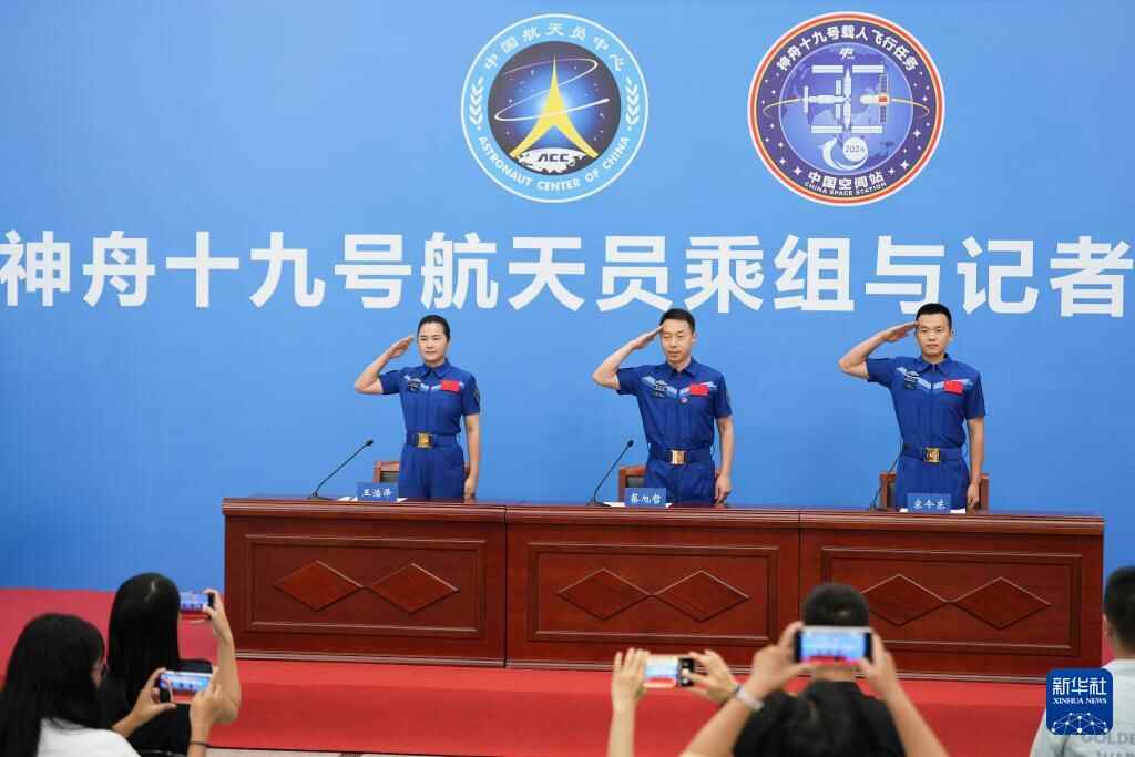 7月9日,在北京航天城,神舟十九号航天员蔡旭哲(中)、宋令东(右)、王浩泽在记者见面会上敬礼致意。新华社记者 厉彦辰 摄