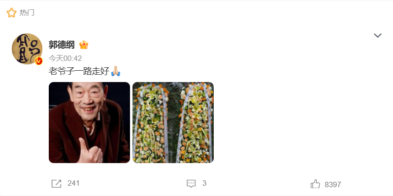 10日凌晨,郭德纲发文悼念:“老爷子一路走好”,并配图杨少华生前照片及德云社敬献的花圈。