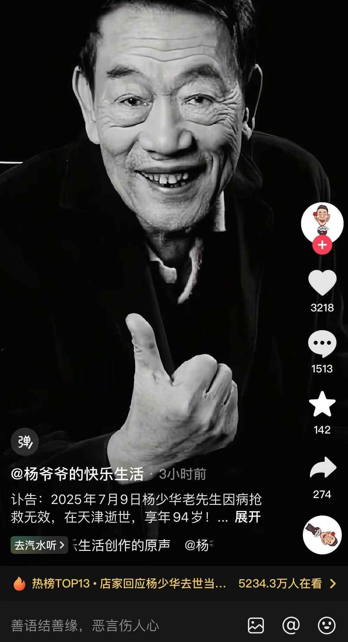 7月10日凌晨,“杨爷爷的快乐生活”账号发布讣告: