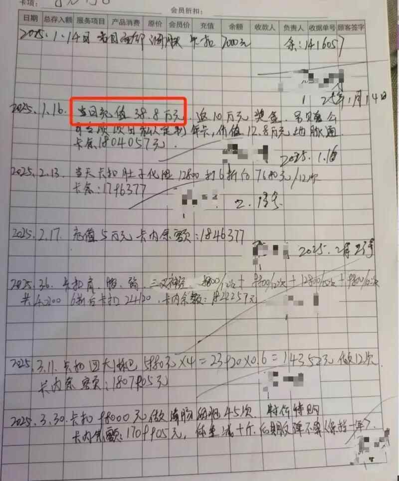程先生提供的门店给其出示的充值和消费记录,他一次充值就高达38.8万元。图片来源/受访者供图
