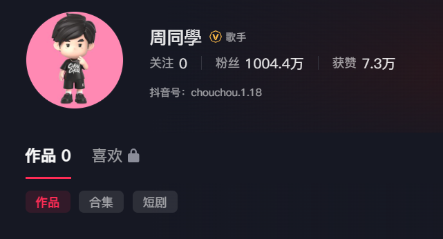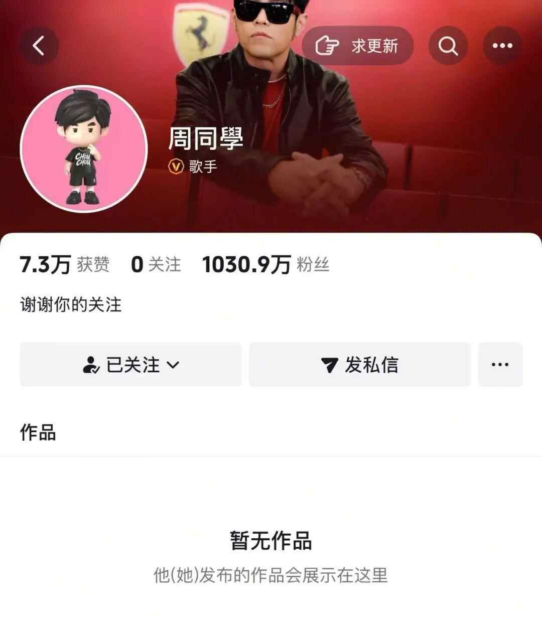 截至目前,周杰伦抖音账号“周同学”粉丝数突破千万,账号内尚未有内容发布。
