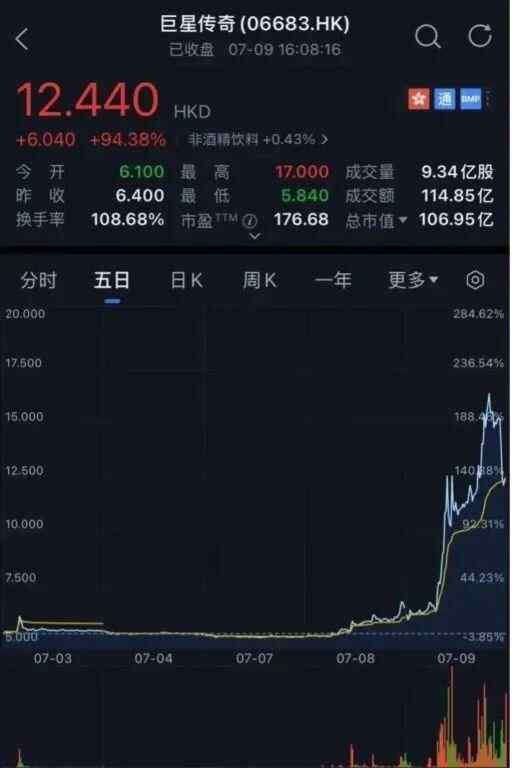 受该消息的提振,“周杰伦概念股”巨星传奇(6683.HK)9日收涨94.37%,收盘价为12.44港元,总市值106.95亿港元,单日成交量9.34亿股,成交额达114.85亿港元;盘中一度拉升涨165.62%,两个交易日暴涨146.34%。