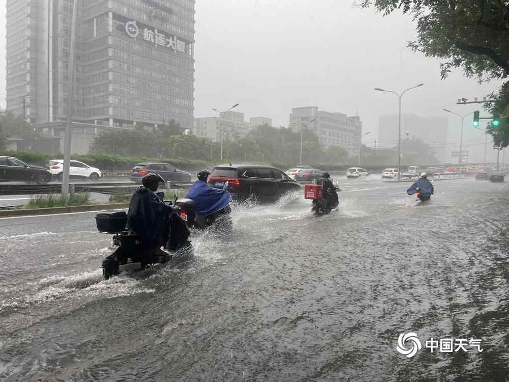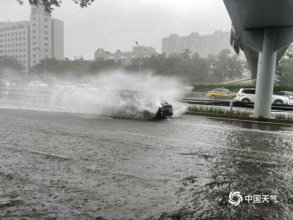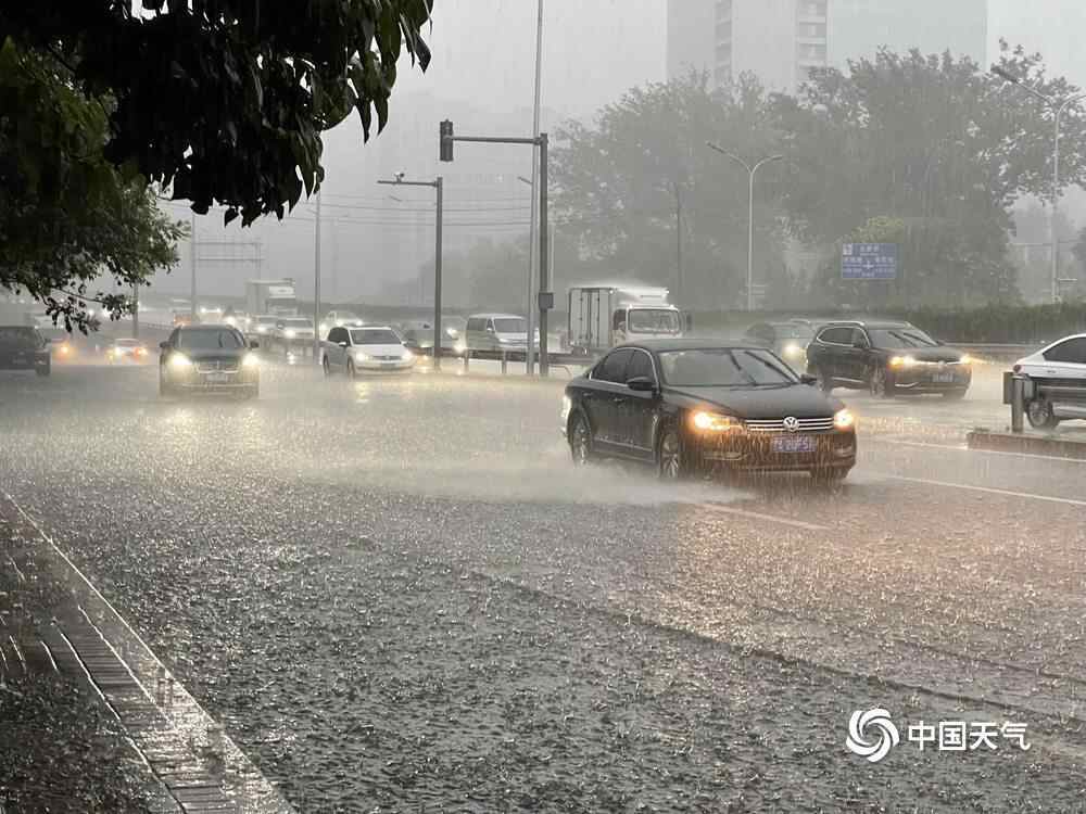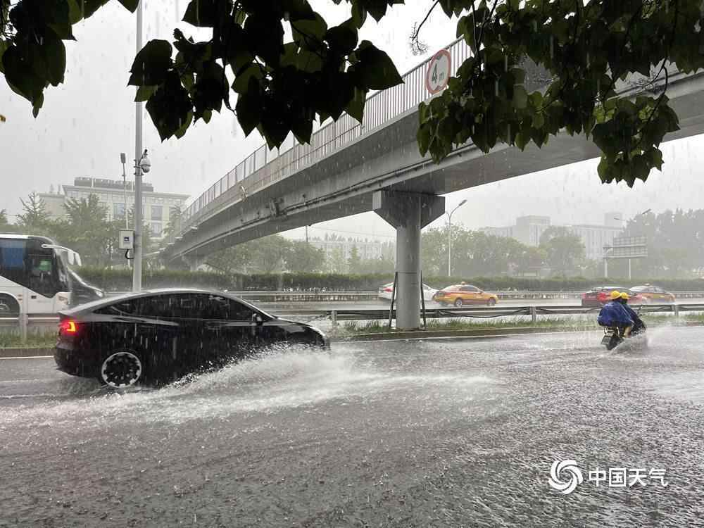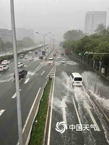 记者在路上看到,北京短时雨强较大,部分路段出现明显积水,开车如行船。