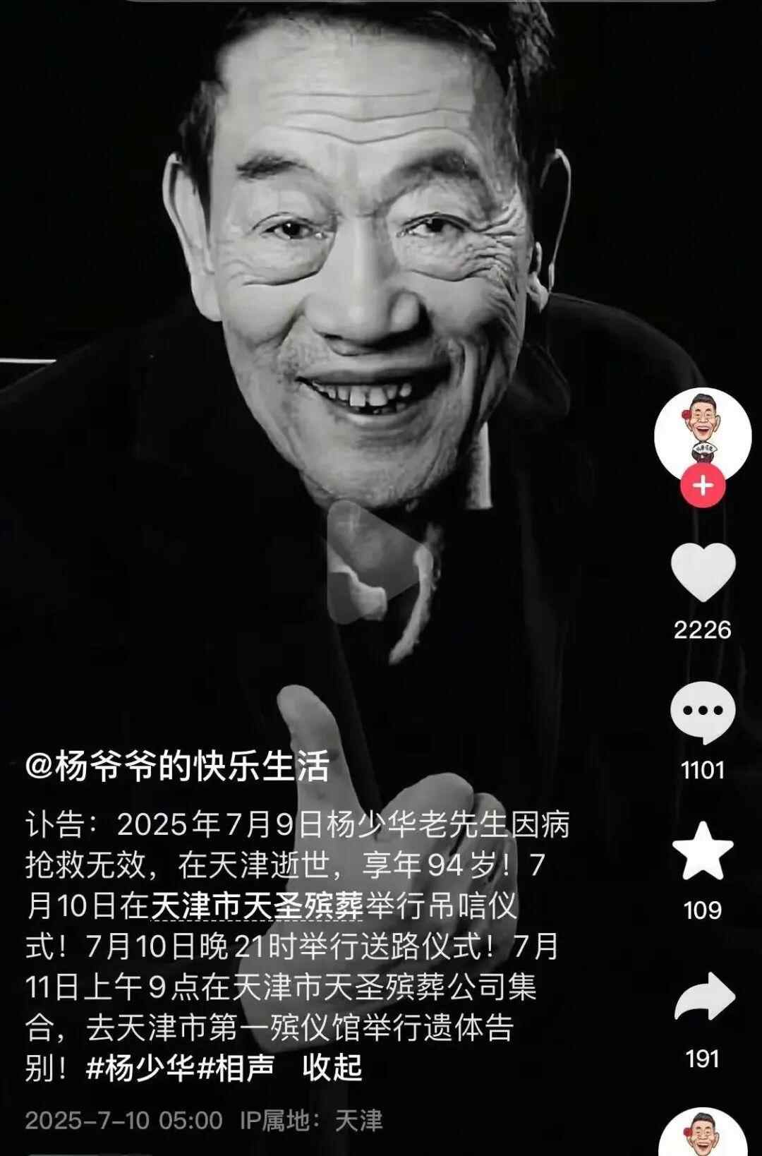 7月9日晚,天津市曲艺团发布讣告:著名相声表演艺术家,杨少华于2025年7月9日因病去世,享年94岁。
