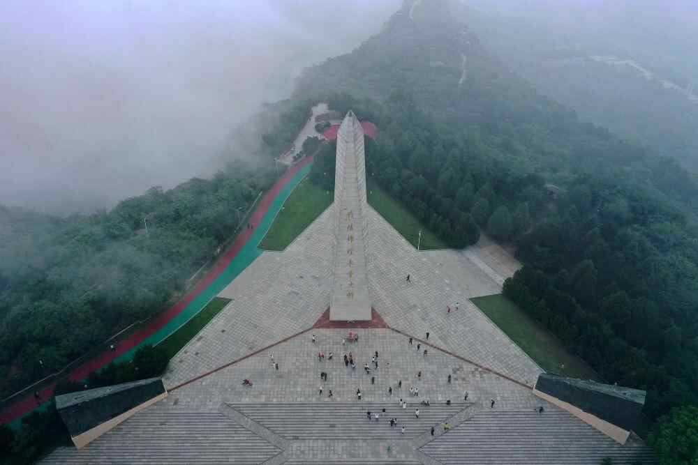 山西阳泉,一场新雨后的狮脑山云雾苍茫。百团大战纪念馆巍然矗立于山巅。
