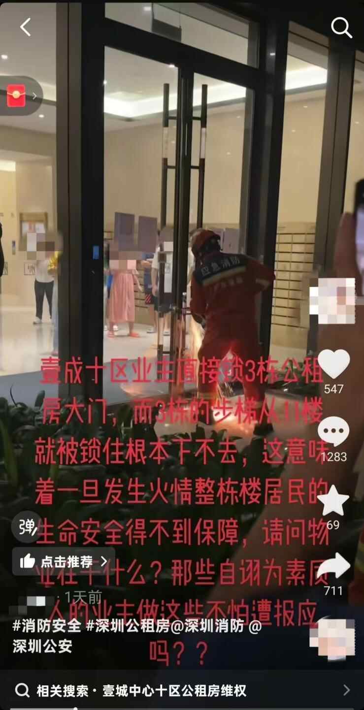 7月9日,深圳壹城中心十区一公租房住户于社交平台发布视频,声称其所居住的公租房被其他楼栋的业主封锁了大门,并表示这样的行为已经造成了安全隐患。视频中可见,其住处一楼大门被关闭,消防员正用电锯锯开被锁在门上的U型锁。