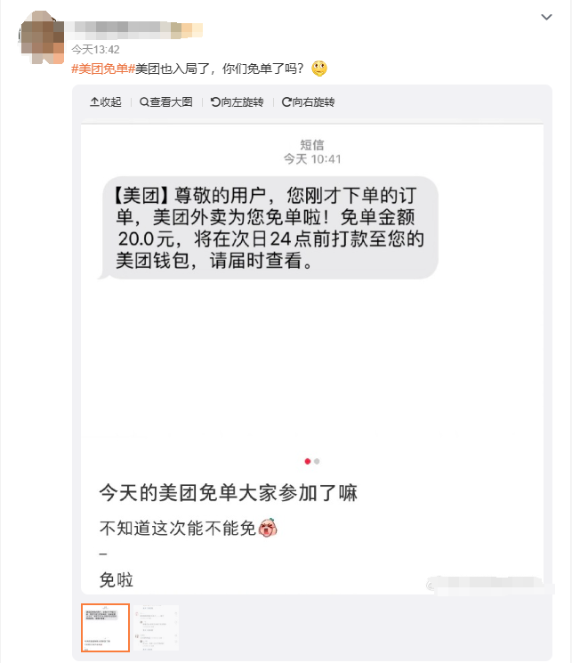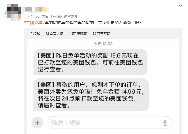 今天(7月10日),#美团免单#冲上热搜。有网友反映,收到了美团外卖免单的通知短信,似乎在说明外卖平台“大战”又升级了。