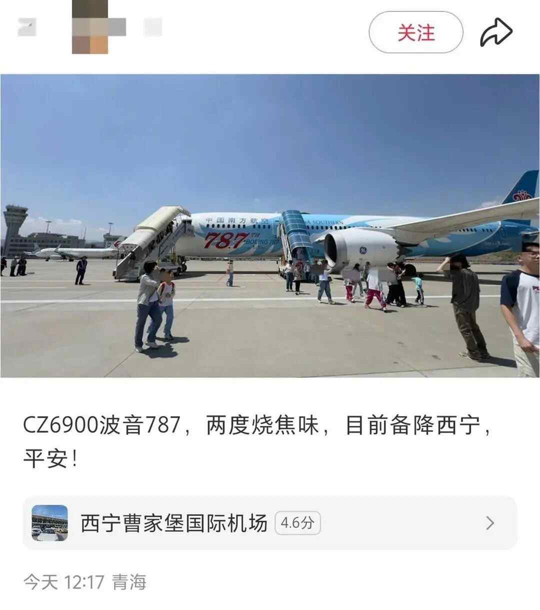 7月10日中午,有网友发帖称,南航CZ6900航班出现烧焦味,备降西宁机场。