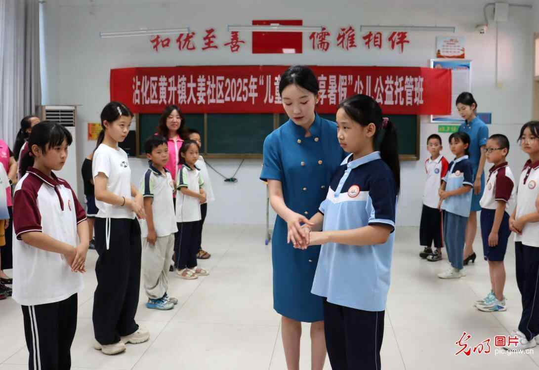 在江西省共青城市未成年人救助保护中心的暑期托管班,孩子们在大学生志愿者的悉心陪伴与辅导下,积极参与舞蹈、口才、暑假作业辅导等各类课程,开启了一段充实而有趣的暑期时光。(潘成摄/光明图片)