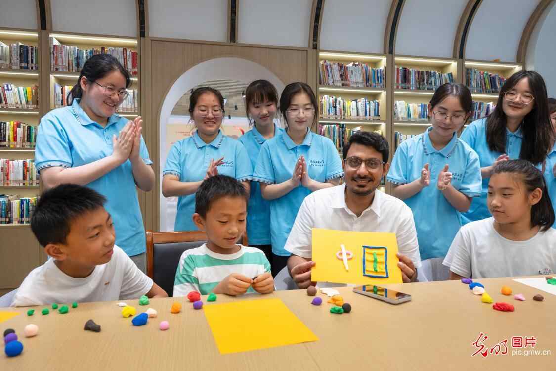在安徽省芜湖市繁昌区孙村镇中分村,安徽师范大学巴基斯坦籍国际大学生(前左三)在展示和暑托班的孩子一起做的手工作品。通过互动游戏,中外青年以寓教于乐的方式激发儿童创造力。(肖本祥摄/光明图片)
