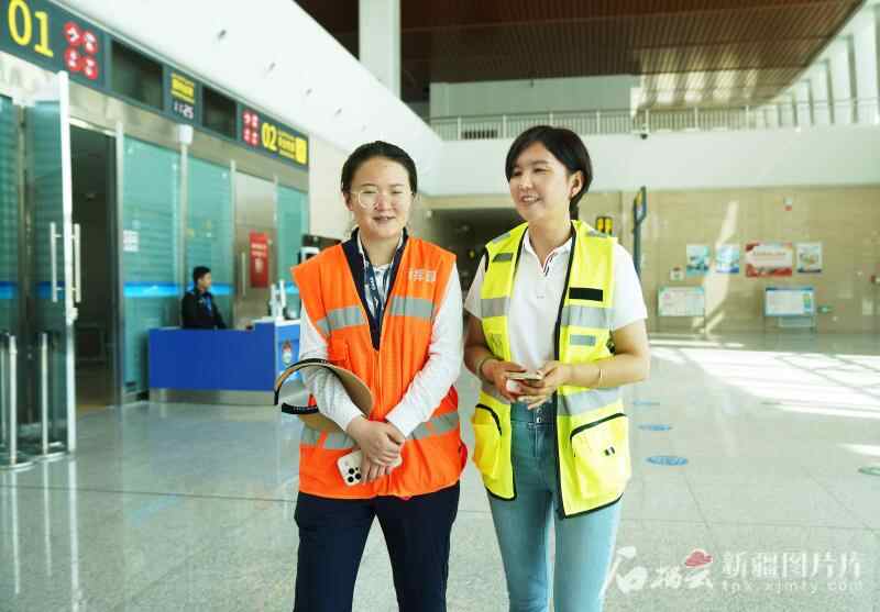 7月4日,记者加孜拉·泥斯拜克(右)在采访塔什库尔干红其拉甫机场开通后的变化。