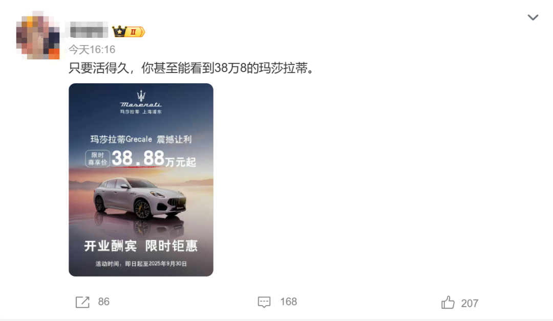 近日,名为“上海浦东玛莎拉蒂”的账号发布海报称,玛莎拉蒂的SUV车型Grecale限时尊享价38.88万元起,活动时间截止到9月30日。官方信息显示,玛莎拉蒂Grecale的指导价为65.08-103.88万元,相比之下,“上海浦东玛莎拉蒂”的起售价低了26.2万元。