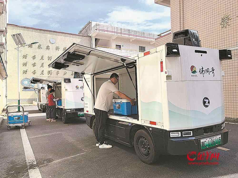 每天11时30分左右,三辆无人车准时从水头中学饭堂出发,载着刚出锅的热饭菜穿过田埂村巷,最远跑40分钟,最近15分钟,稳稳停在各村委会门口。60岁以上的老人不用出村,掏2-3元钱就能捧回两荤一素。