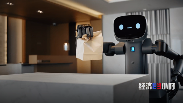 还有一款机器人负责打扫卫生并做收纳工作,在面对杂乱的桌面时,它既能精准拾捡垃圾,巧妙避开手机、雨伞等物品,还能分辨出细碎的炸鸡骨头,确保无一遗漏。