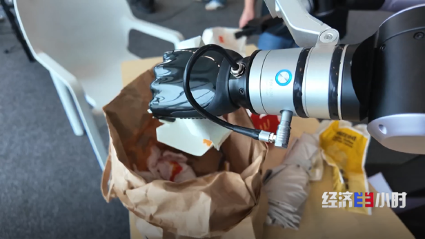还有一款机器人负责打扫卫生并做收纳工作,在面对杂乱的桌面时,它既能精准拾捡垃圾,巧妙避开手机、雨伞等物品,还能分辨出细碎的炸鸡骨头,确保无一遗漏。