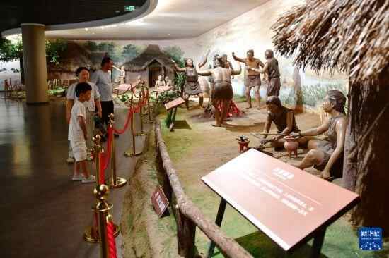 7月14日,游客在大汶口遗址博物馆内参观先民生活场景复原模型。