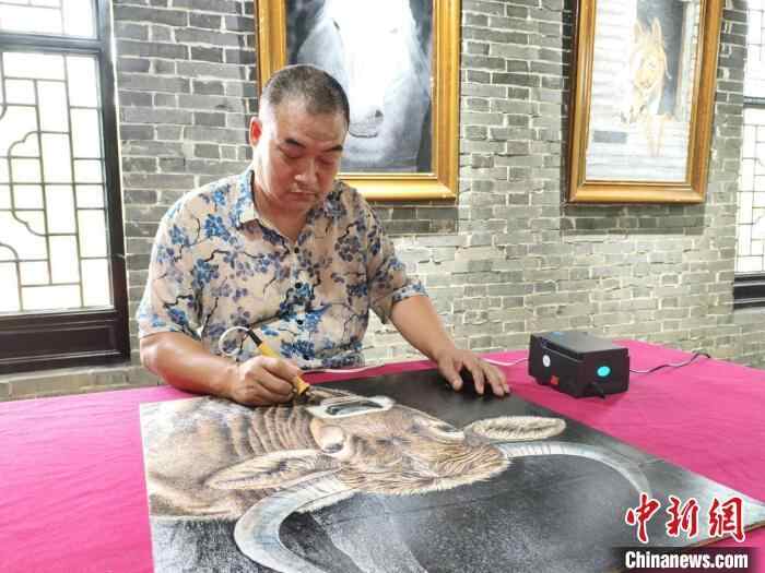 中新网江西安福7月16日电 (巫发阳 杨丹 李政澜)“看,这斑斓的毛色,不是画上去的,而是烙出来的。”笔架山下,江西吉安市安福县枫田镇车田旅游新村烙画馆内,全国首批乡村工匠名师、安福县新联会自由职业者协会副会长刘继龙正在烙画。