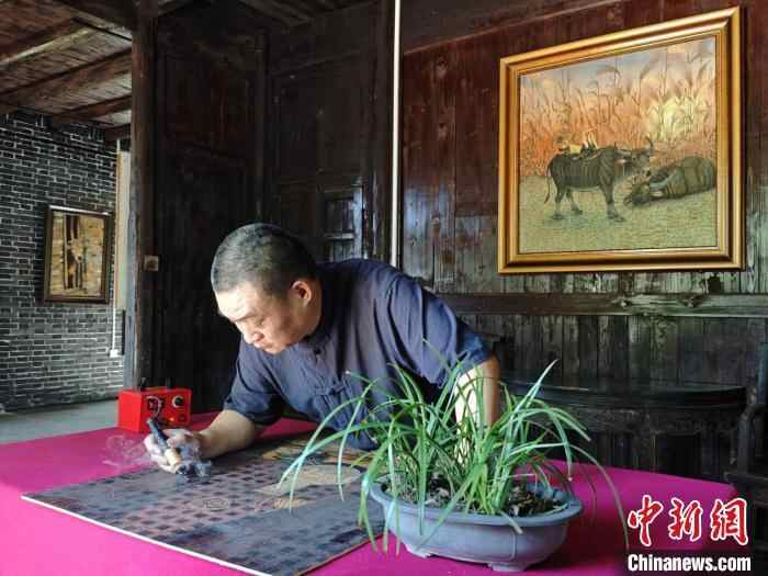 图为安福县枫田镇车田旅游新村烙画馆内,刘继龙正在烙画。安福县委统战部供图