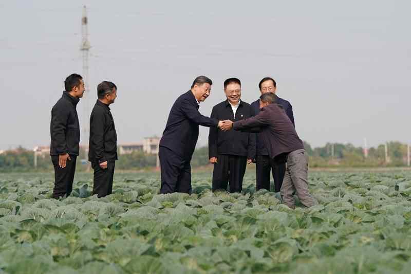 △ 2024年11月5日,在湖北省咸宁市嘉鱼县潘家湾镇十里蔬菜长廊考察时,习近平总书记同菜农亲切交流。