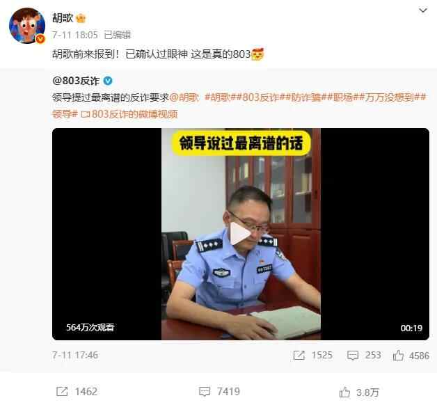 7月15日晚,“803反诈”账号更新后续,胡歌现身反诈视频。胡歌真的来了!