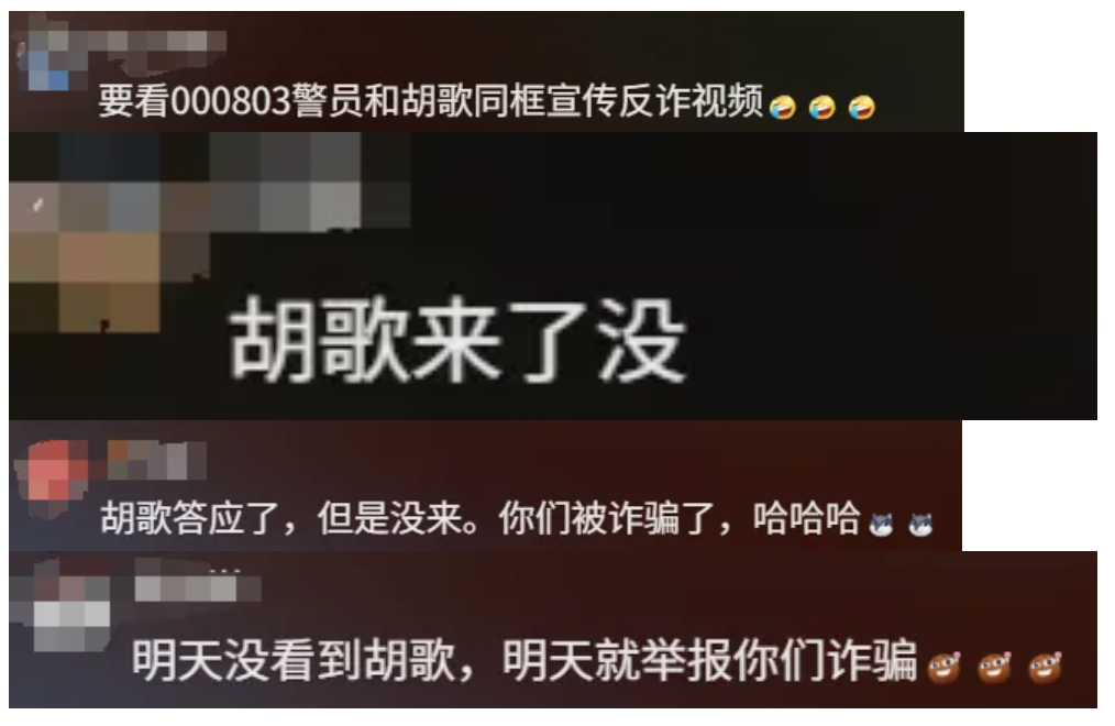 在之后803反诈的每条动态下都有网友留言:“胡歌来了吗?”“你们别被胡歌反诈宣传了”。