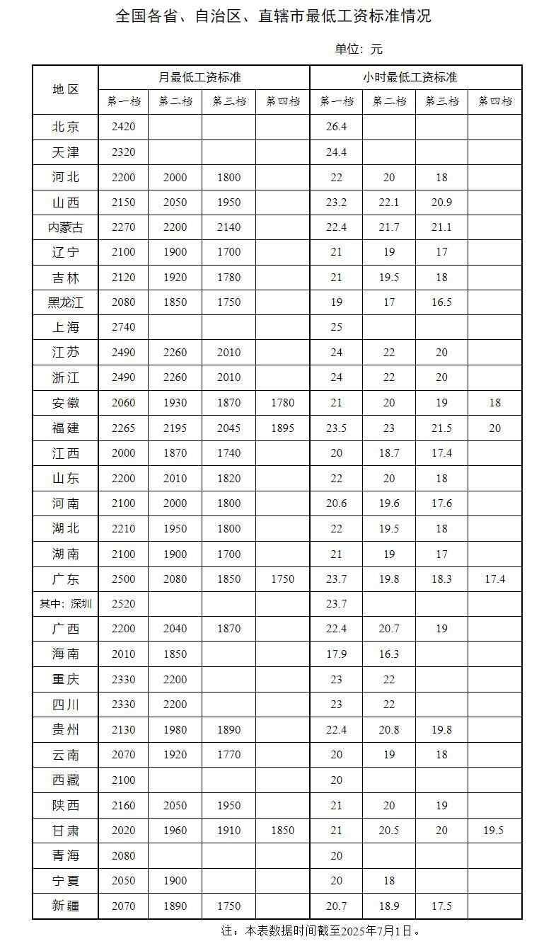 人力资源和社会保障部7月15日发布了全国各省、自治区、直辖市最低工资标准情况(截至2025年7月1日)。