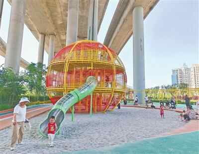 夏日傍晚,夕阳斜照。山东青岛市市北区跨海大桥高架桥下的橙岛时尚体育公园里,大人散步,孩子嬉戏,一派热闹欢快。