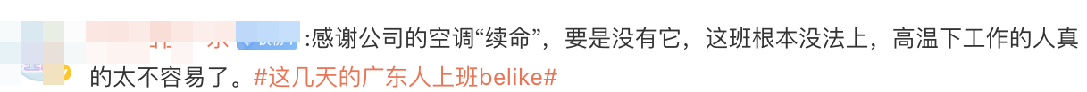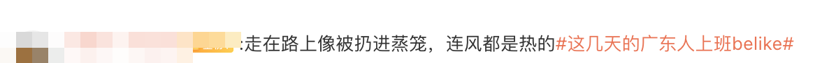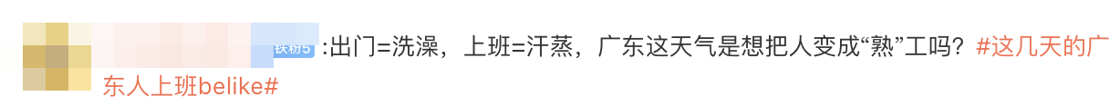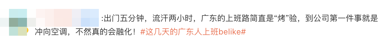 “出门五分钟,流汗两小时”“外面像个巨型桑拿房,上班全靠意志力支撑““到公司第一件事就是擦汗补妆(虽然很快又会花),广东打工人懂的都懂”“出门=洗澡,上班=汗蒸,广东这天气是想把人变成‘熟’工吗?”……话题下网友的神评论层出不穷,这些幽默的吐槽在一定程度上缓解了高温带来的不适感。