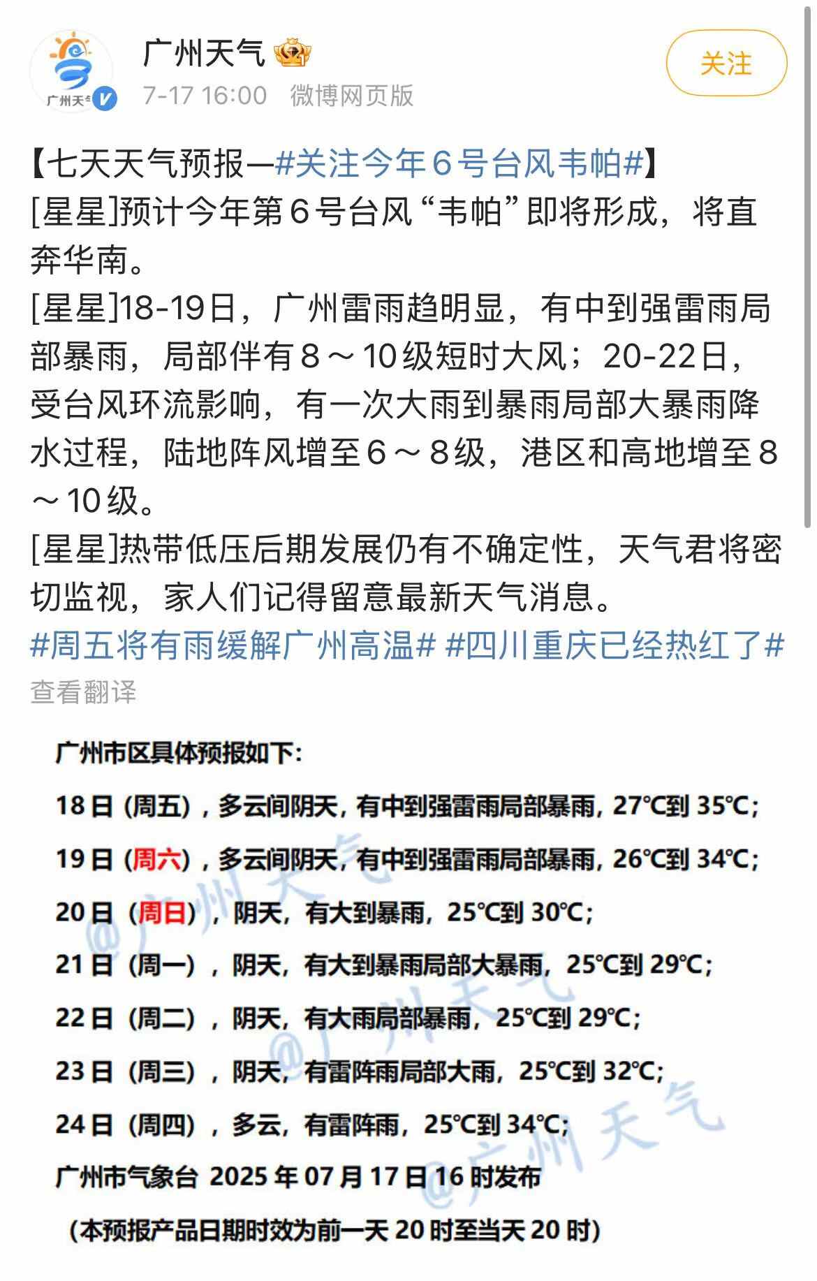 7月17日16:00,广州天气官方微博带这一话题发布天气预报,18-19日,广州雷雨趋明显,有中到强雷雨局部暴雨,局部伴有8~10级短时大风。