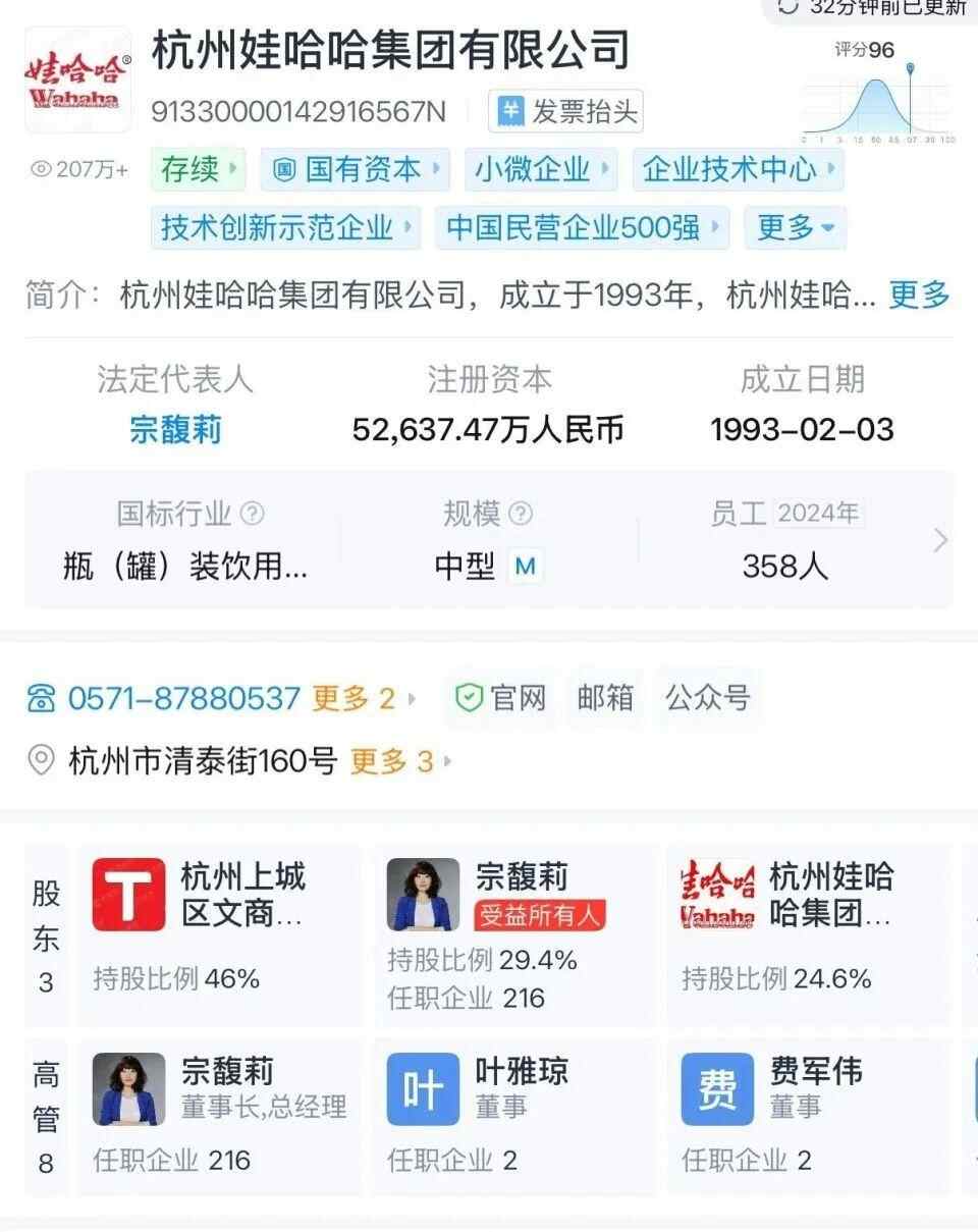 此前娃哈哈方面向媒体透露,家族内部事务,与公司运营、业务无关,公司不会提供任何答复口径或相关回应。工商信息显示,杭州娃哈哈集团有限公司(下称“娃哈哈集团”)大股东为杭州市上城区财政局下属二级企业杭州市上城区文商旅投资控股集团有限公司。