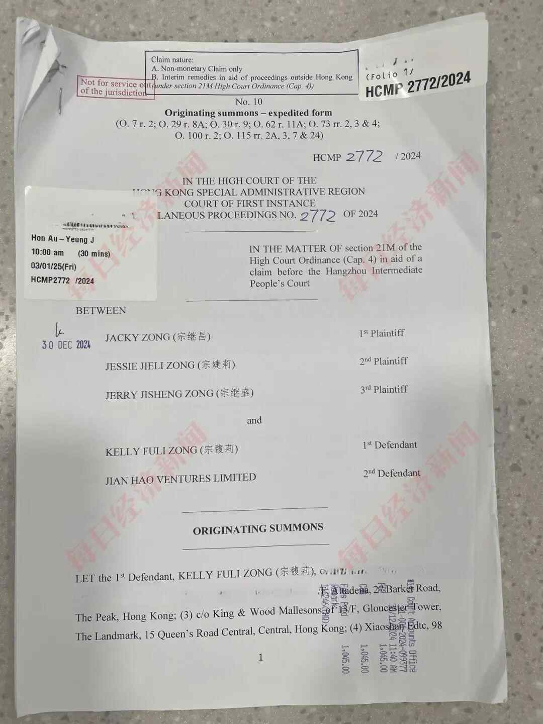 7月15日,记者从从香港高等法院查询获悉了一份以上述三名“子女”为原告,宗馥莉、Jian Hao Ventures Limited(下文称为建昊企业有限公司)为被告人的诉状。