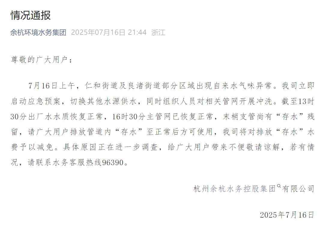 记者注意到,7月16日21时44分,余杭环境水务公众号发布了情况通报。通报中提到:“ 7月16日上午,仁和街道及良渚街道部分区域出现自来水气味异常。我司立即启动应急预案,切换其他水源供水,同时组织人员对相关管网开展冲洗。截至13时30分出厂水水质恢复正常,16时30分主管网已恢复正常,末梢支管尚有‘存水’残留,请广大用户排放管道内‘存水’至正常后方可使用,我司将对排放‘存水’水费予以减免。具体原因正在进一步调查。”