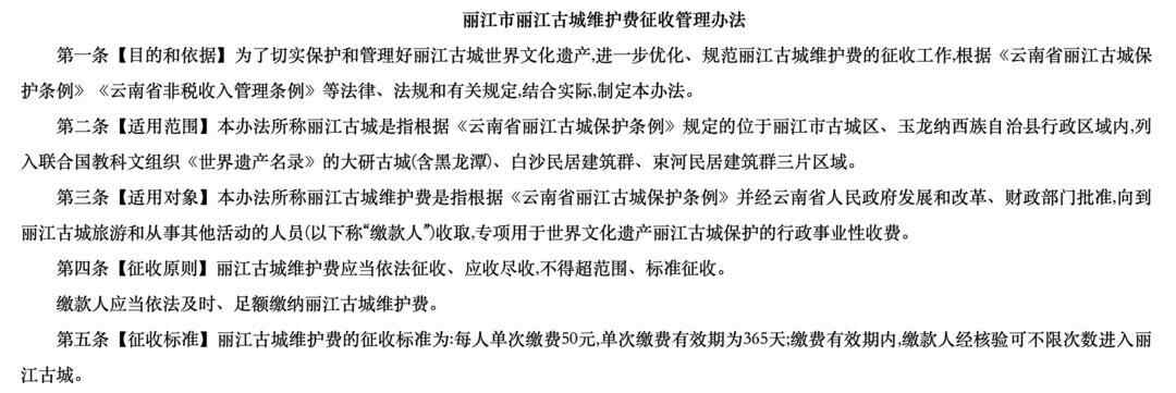 近日,丽江市人民政府对外发布《丽江市丽江古城维护费征收管理办法》。该办法将于今年8月1日起正式施行,明确进入丽江古城未按照规定缴纳维护费的,由古城保护管理机构责令缴纳,征收标准为每人单次50元,有效期延长至365天。