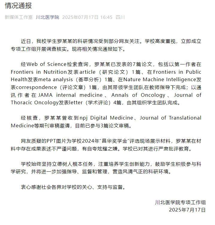 7月17日,川北医学院专项工作组发布通报称,近日,学校学生罗某某的科研情况受到部分网友关注。学校高度重视,立即成立专项工作组开展调查核实。现将相关情况通报如下。