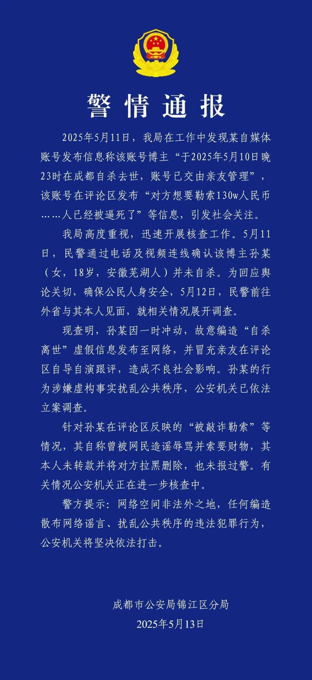 5月13日,成都市公安局锦江区分局发布声明称,查明后发现该博主孙某并未自杀。孙某因一时冲动,故意编造“自杀离世”虚假信息发布至网络,并冒充亲友在评论区自导自演跟评,造成不良社会影响。孙某的行为涉嫌虚构事实扰乱公共秩序。