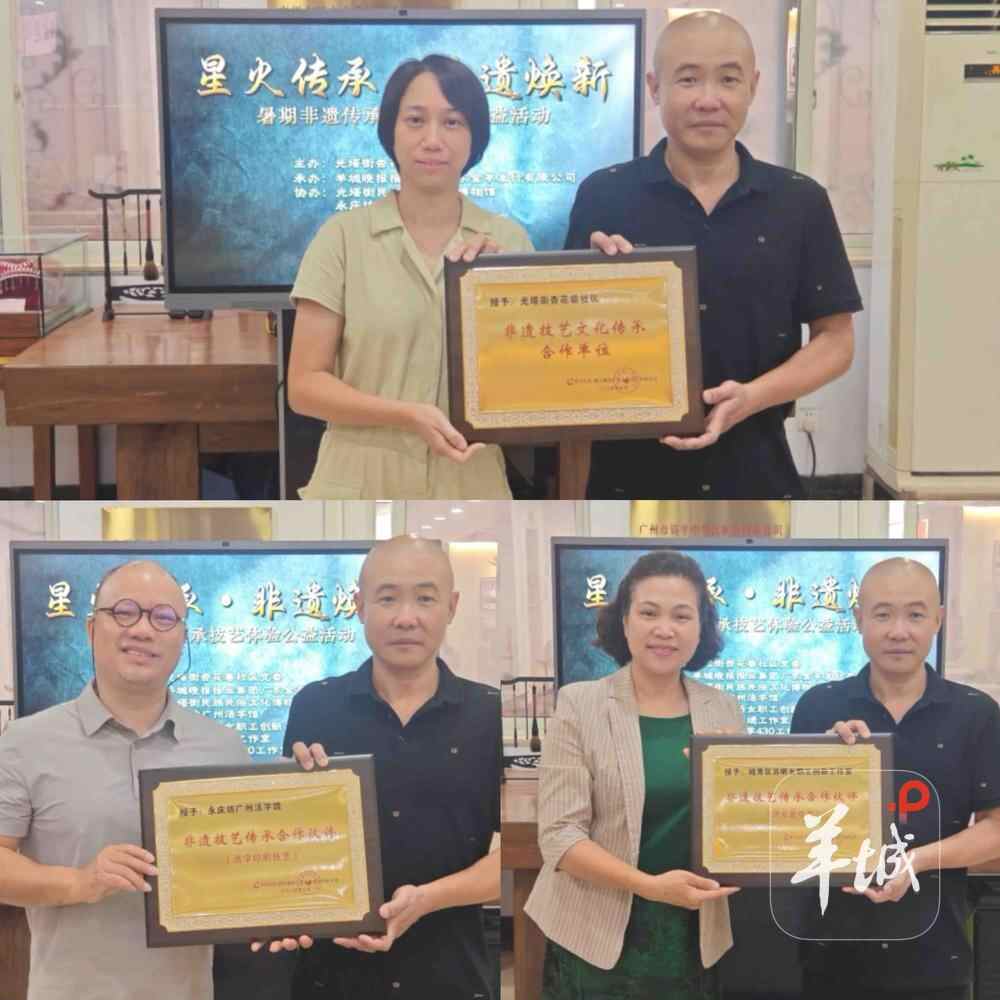 7月16日授牌仪式上,广东金羊发行有限公司授予社区“非遗传承合作单位”称号,永庆坊活字馆与苏昕女职工创新工作室获“非遗传承合作伙伴”认证。