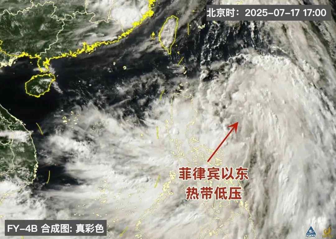 7月17日17时,菲律宾以东热带低压卫星影像。图/国家卫星气象中心风云四号卫星天气应用平台截图,记者梁怿韬作标注