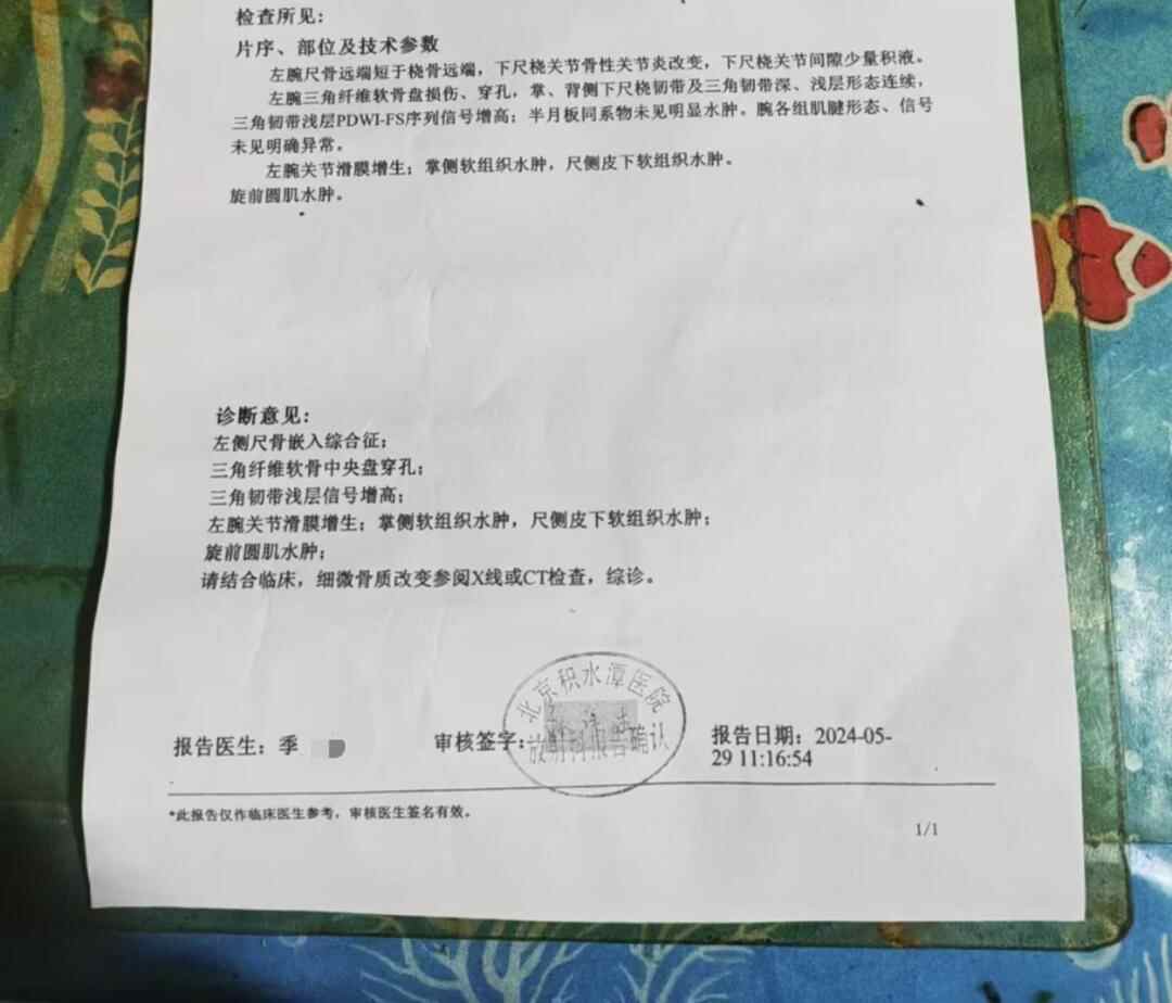 近一年后另一份诊断报告则显示:左侧尺骨潜入综合征、三角纤维软骨中央盘穿孔、三角韧带浅层信号增高、左腕关节滑膜增生、掌侧软组织水肿、尺侧皮下软组织水肿、旋前圆肌水肿等结果。