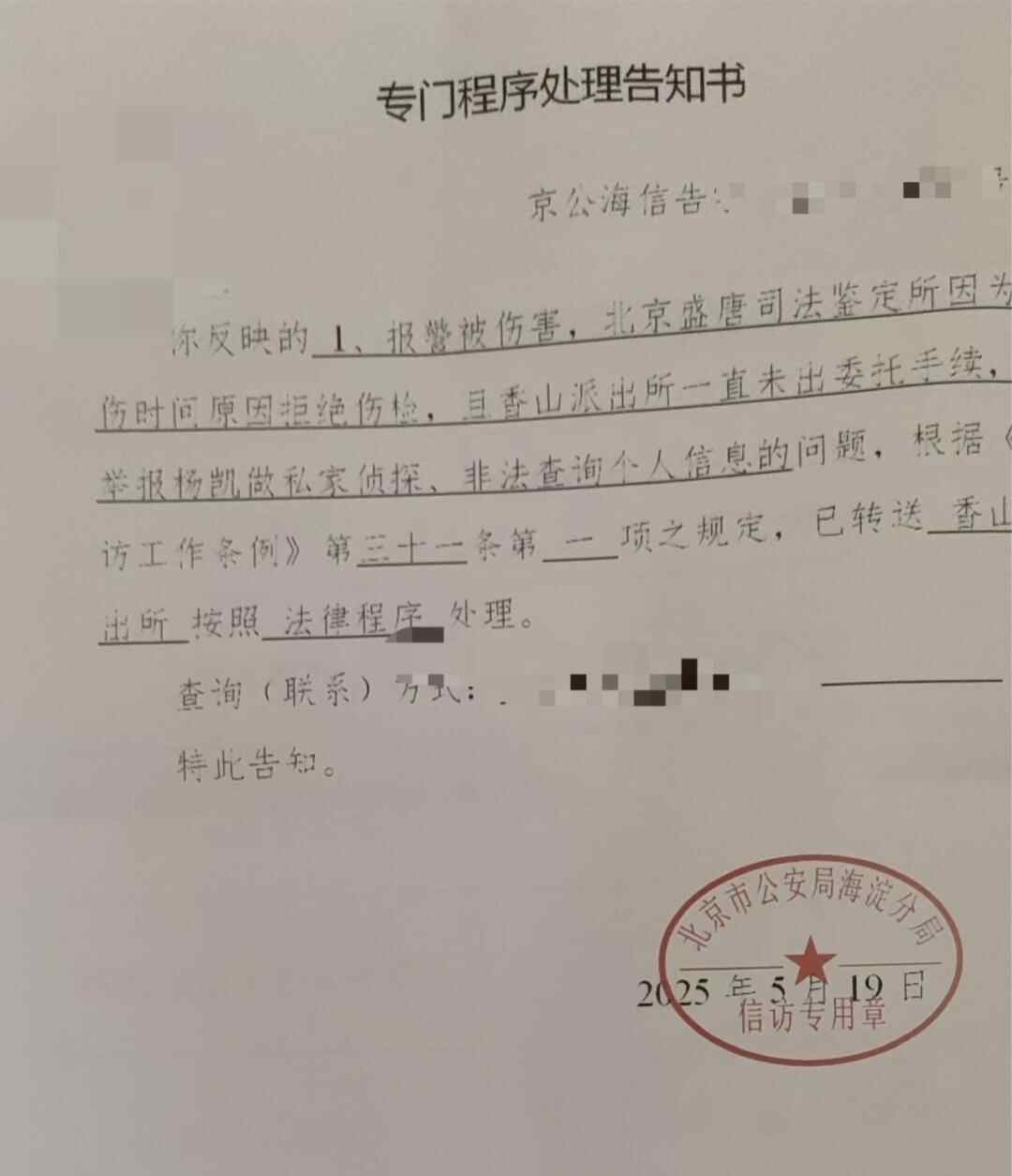 5月19日,小玲收到北京市公安局海淀分局的“专门程序处理告知书”,回复其报警被伤害,北京盛唐司法鉴定所因为受伤时间原因拒绝伤检,且香山派出所一直未出委托手续。至于举报杨某做私家侦探、非法查询个人信息的问题,已转送香山派出所按照法律程序处理。