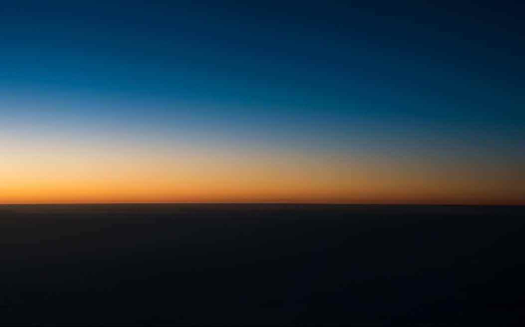 夕阳刚刚坠落,金色的余晖还映在天空,云海却已陷入迷茫的夜色。灰黑的天平线上,是金黄向蓝色过渡的渐变,越往高远,这蓝色就越深沉,一直伸展到遥不可及的广袤空间,而那幽深未知的远方,只有无尽的墨蓝。