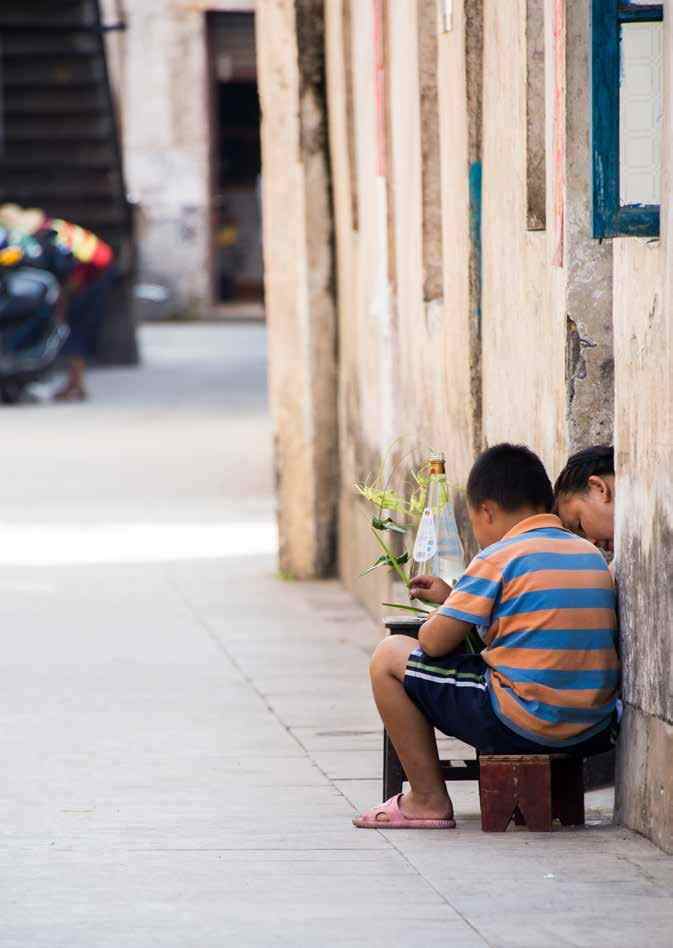 敦实的男孩儿,短发短衣短裤旧拖鞋,坐在小板凳上,背靠门扉低着头,用长长的绿草茎叶,聚精会神地编织蚂蚱。妈妈就在旁边,安静地打着下手。